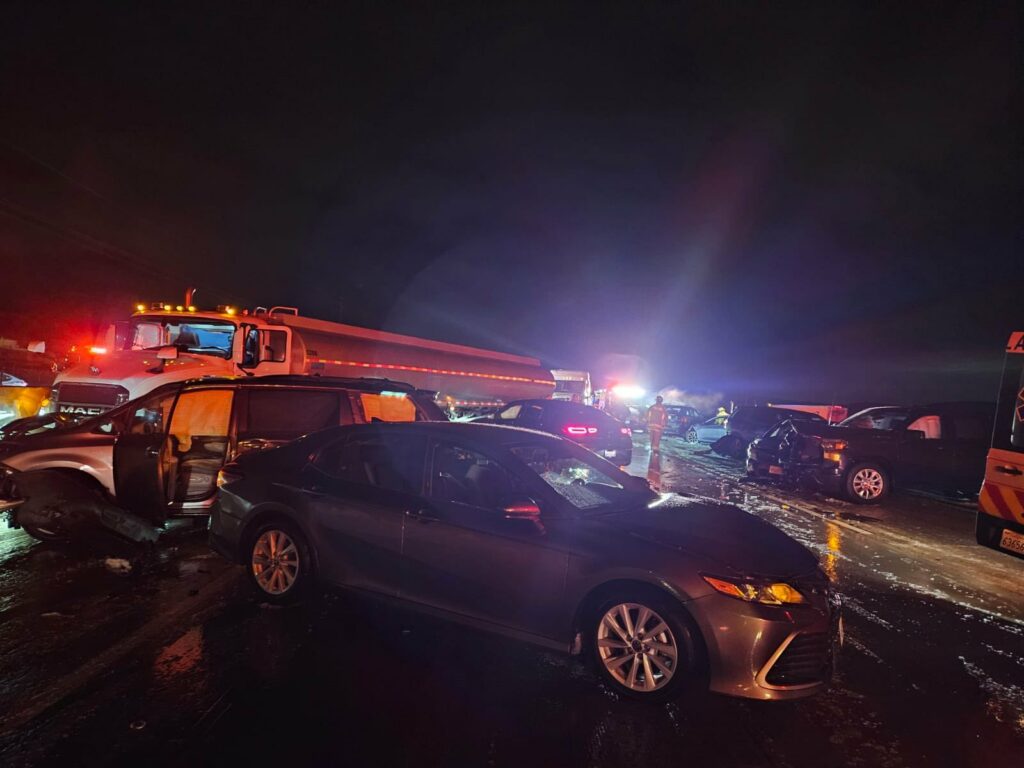 The crash occurred as snow fell just before 10:25 p.m. in the westbound lanes at Wildwood Canyon Road. Witnesses reported slick roadways were to blame for the pile up.